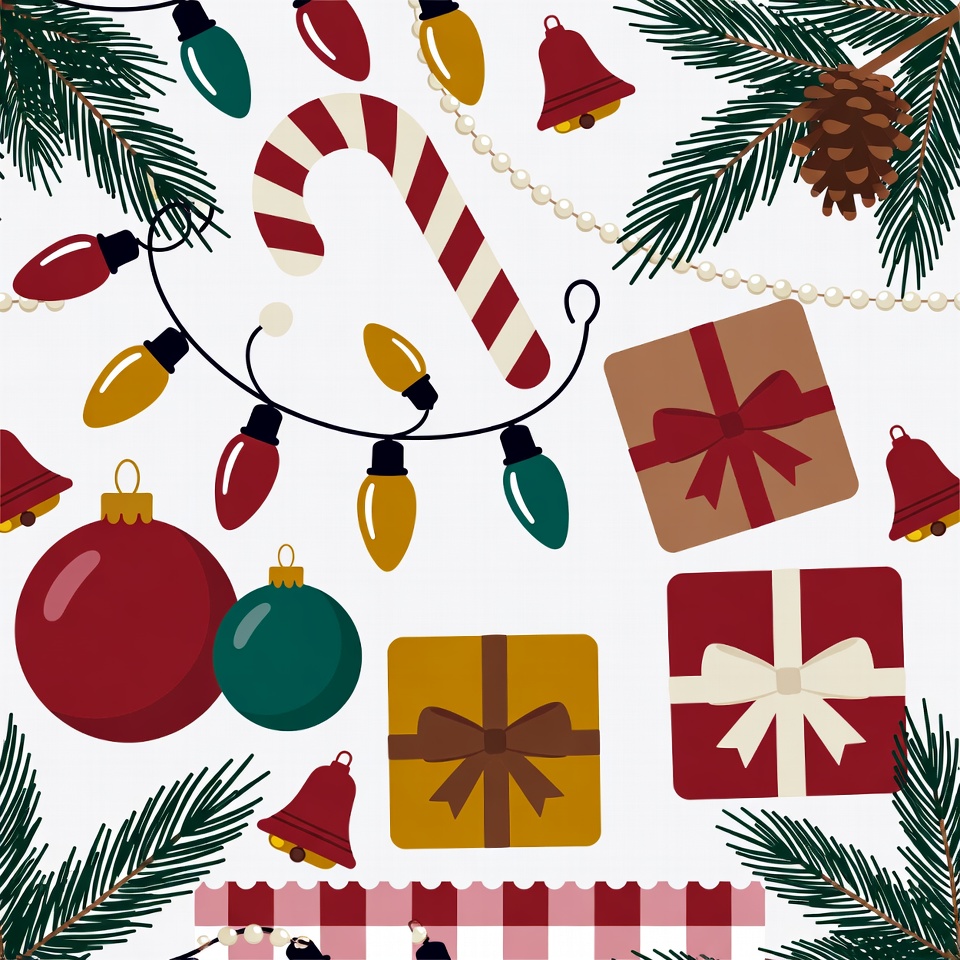 Christmas decoration, beads, bow, candy cane, checkered border, clipart, festive, gift box, green ball, holiday, holiday clipart, illustration, jingle bell, ornaments, pine branch, pinecone, red ball, seamless, string lights, vector, white background, wrapping paper, Christmas pattern