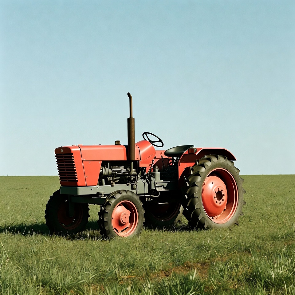 A classic red tractor with large black tires and a tall exhaust pipe stands stationary on a lush green field. The tractor features a front grille and open driver's seat against a clear blue sky. The scene highlights the vibrant red color contrasting with the surrounding grass.