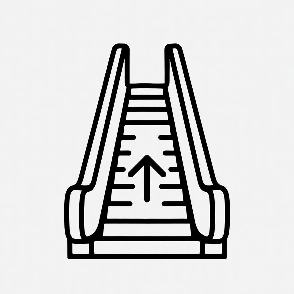 black outline, clipart, handrails, icon, illustration, isolated background, line art, moving stairs, simple graphic, steps, symbol, up arrow, upward escalator, vector, escalator