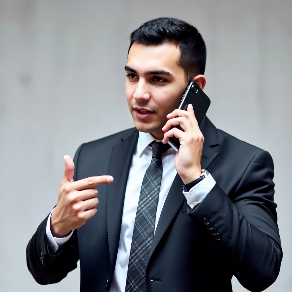 A young man with short dark hair and Middle Eastern features stands against a gray background, wearing a black suit, white shirt, and gray tie. He holds a black smartphone to his ear with one hand while pointing forward with the index finger of his other hand. His expression is engaged as he speaks on the call.