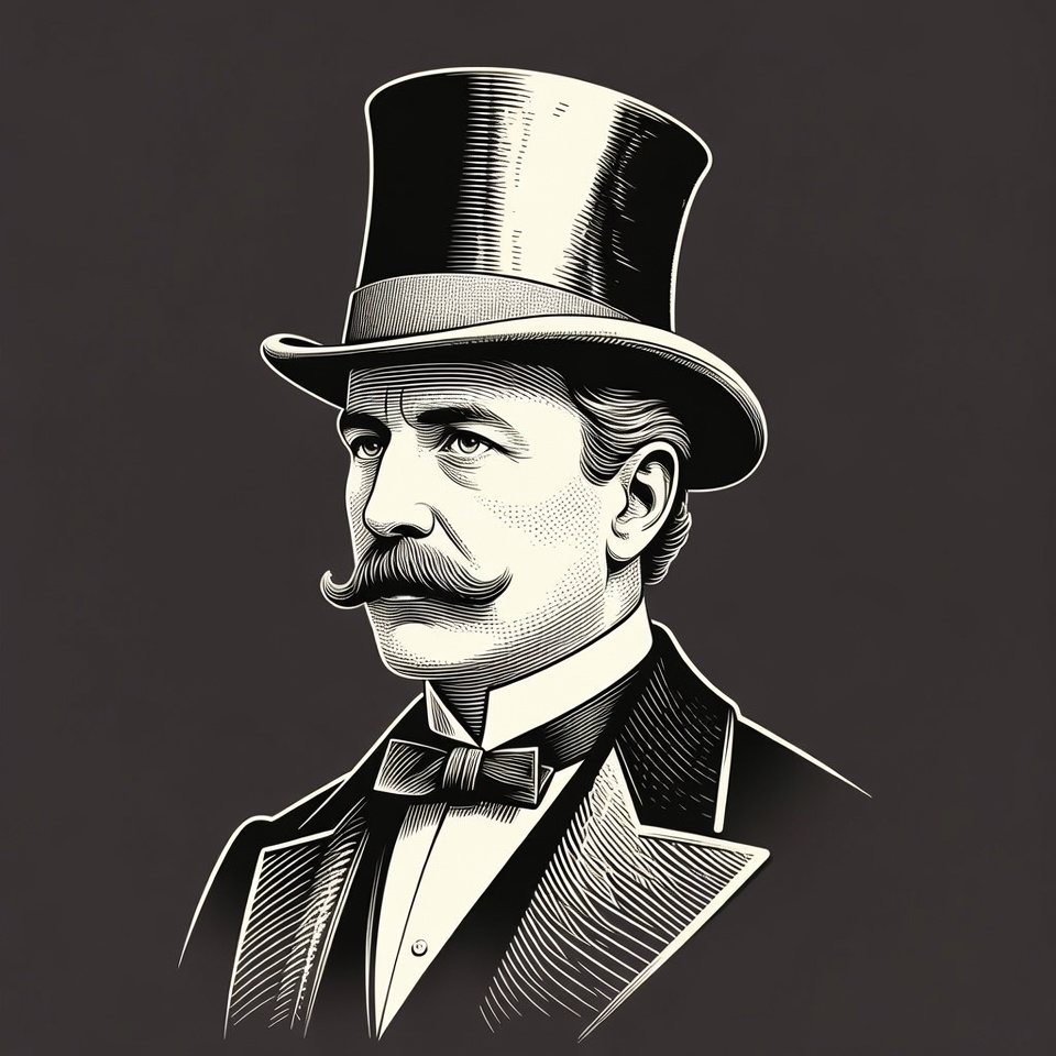 White, bow tie, elegant man, engraving style, formal suit, historical fashion, illustration, isolated background, line art, male, mustache, portrait, profile view, top hat, tuxedo, vintage style, Victorian gentleman