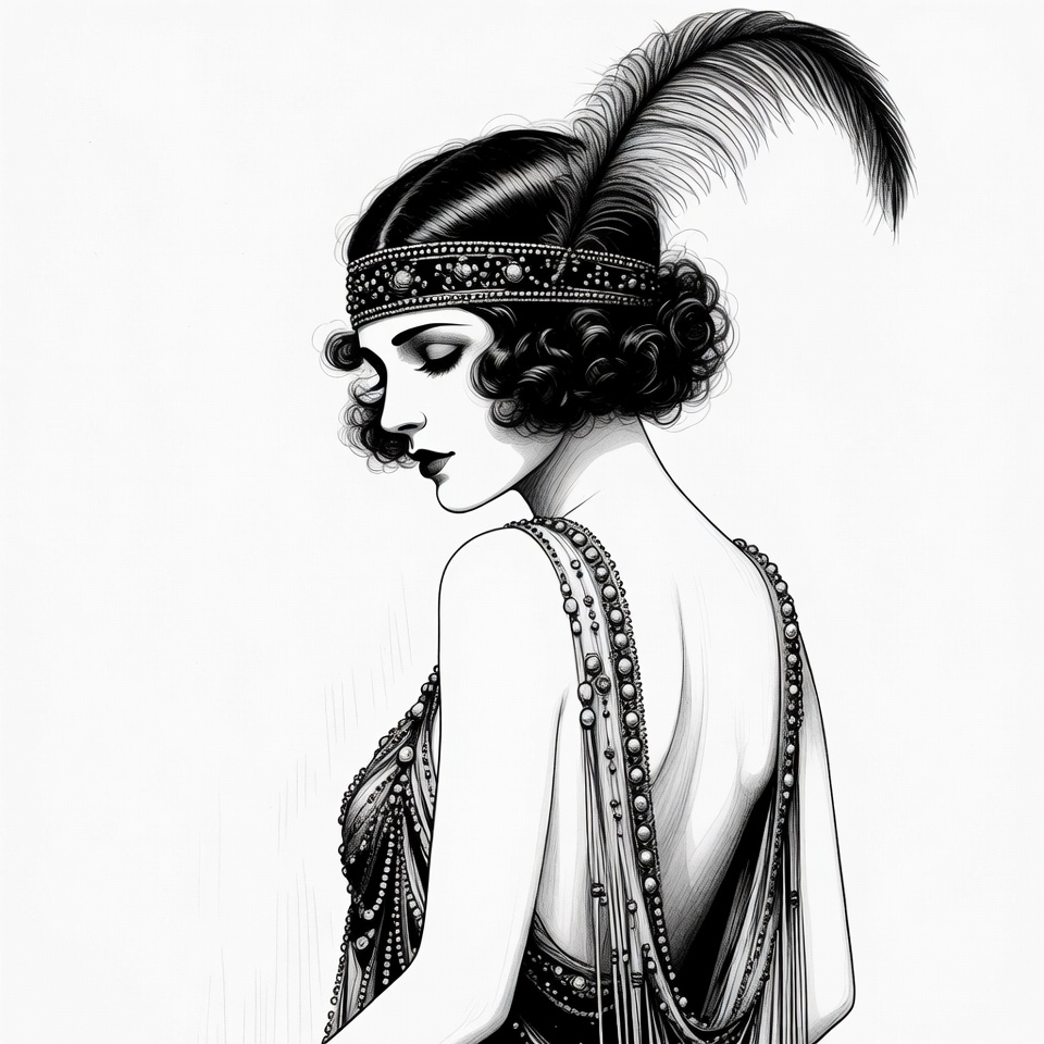 Black and white illustration of a woman in 1920s flapper style, viewed from behind. She wears a beaded headband with large feathers, curly bob hairstyle, and a beaded low-back dress. The image features intricate line art on an isolated white background.