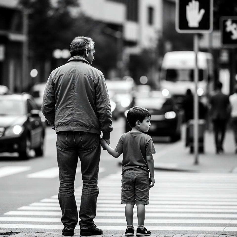A man in a jacket and jeans holds the hand of a young boy in a t-shirt and shorts as they stand on a pedestrian crosswalk. They face forward with blurred urban traffic and buildings in the background. The image is in black and white.