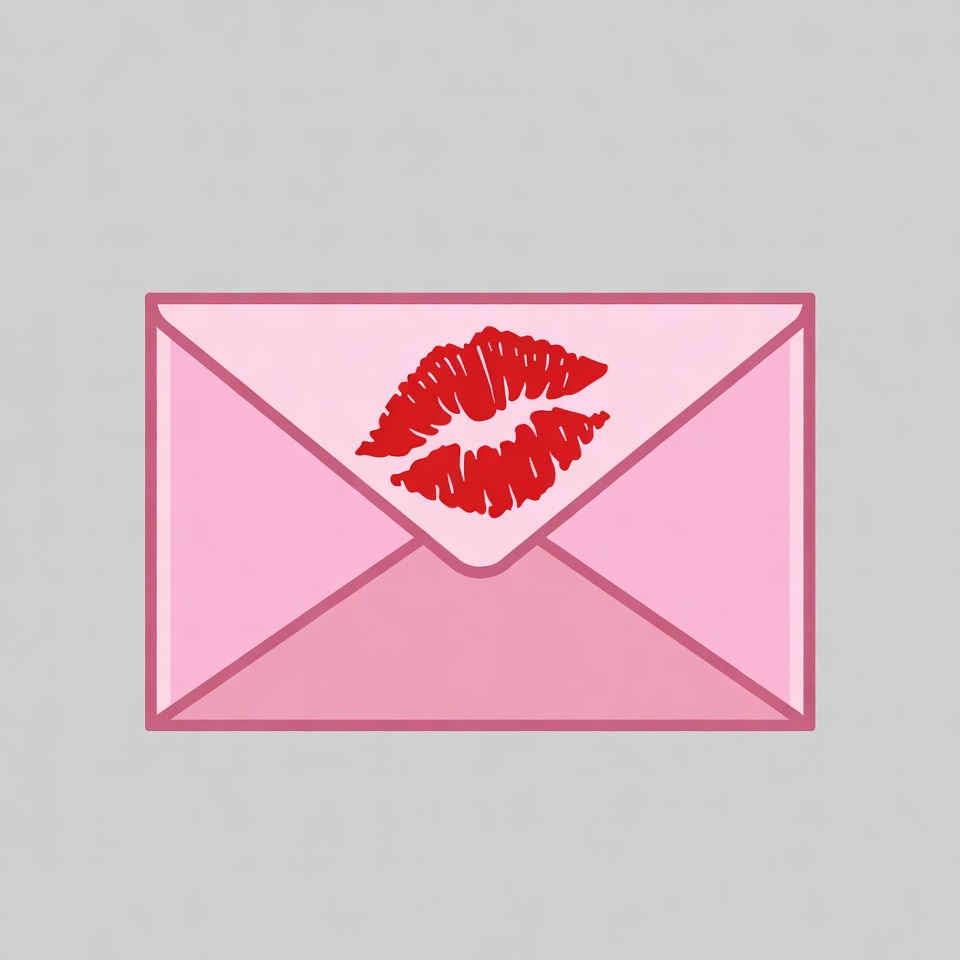 A simple illustration of a pink envelope on a gray background features a bold red lipstick kiss mark in the center. The envelope has a classic folded flap design with smooth outlines. It is rendered in a flat, clipart style.