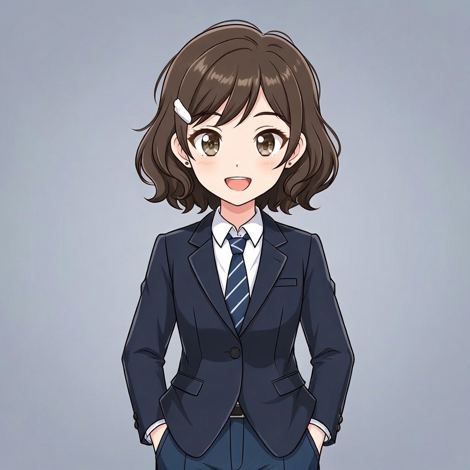 A cute anime girl with wavy brown hair and a hair clip smiles happily while standing with hands in pockets. She wears a navy blue suit jacket, white collared shirt, and striped tie. The illustration features her against a plain gray background.