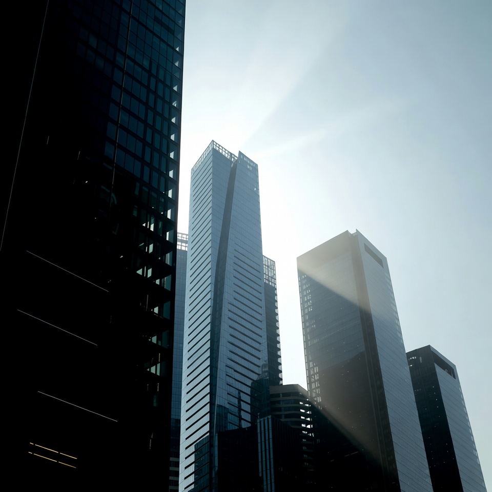 Tall modern skyscrapers rise against a clear sky with bright sun rays piercing through. The glass facades reflect sunlight, creating dramatic contrasts of light and shadow. The image captures an urban skyline from a low angle.