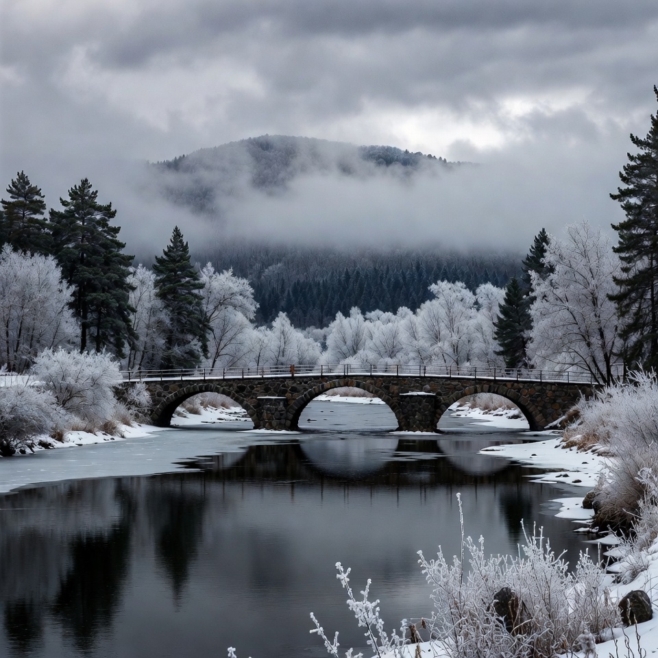 Frosty Stone Bridge over Icy River