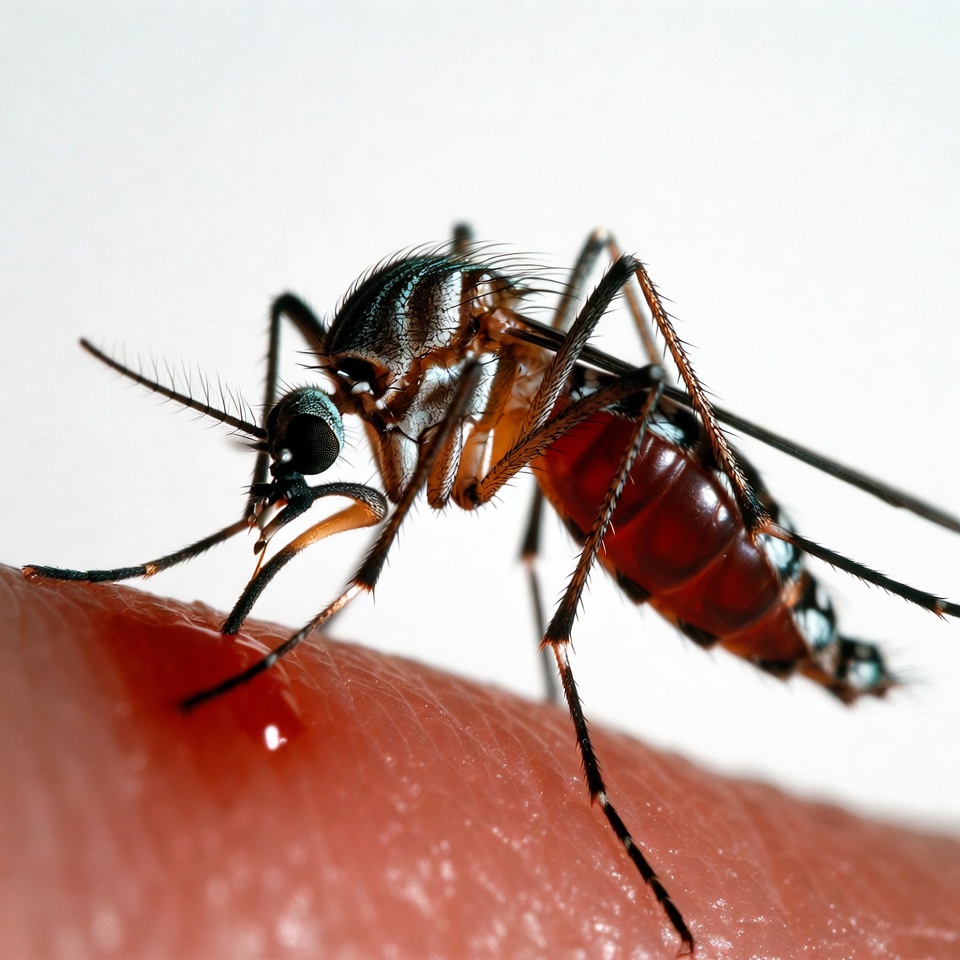 A detailed close-up shows a mosquito with a striped body and long legs sucking blood from human skin. A prominent drop of blood is visible at the bite site. The mosquito is positioned on a plain white background.