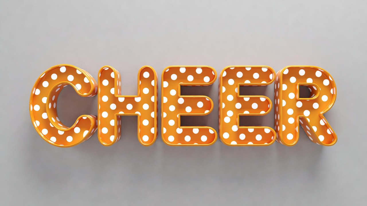 3D text, bold font, cheer word, decorative text, fun letters, graphic design, gray background, isolated, lettering, orange color, orange letters, polka dot, typography, white dots, cheer