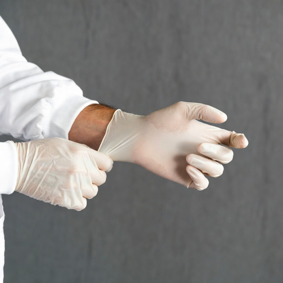 White, arms, clinic, disposable gloves, doctor, gray background, hand protection, hands, healthcare worker, hospital, lab coat, latex gloves, male, medical gloves, nurse, protective gear, putting on gloves, safety gloves, uniform, white coat, man