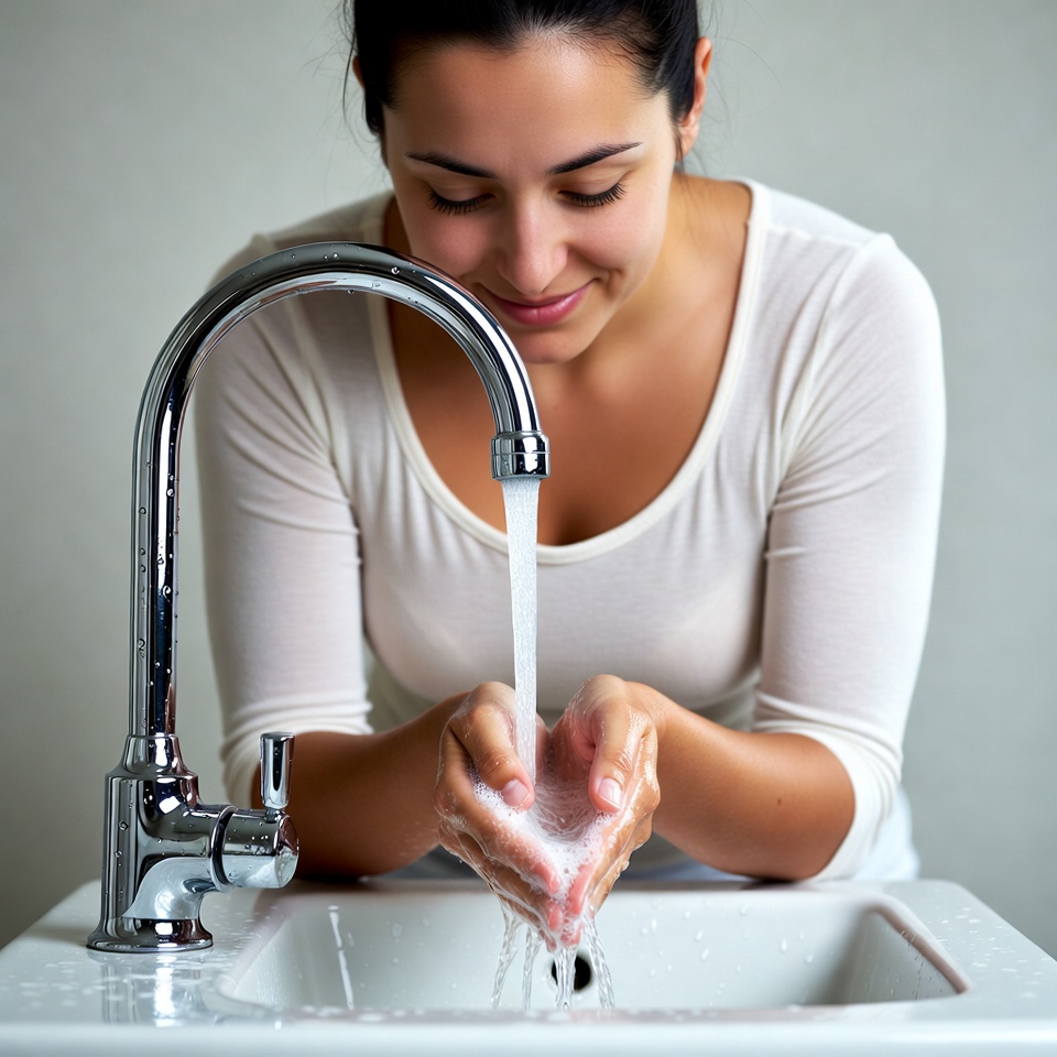 A woman with dark hair leans over a white sink, washing her hands under running water from a chrome faucet. She wears a light-colored long-sleeve top and smiles slightly while creating soap suds in her cupped hands. The background is plain and light-colored.