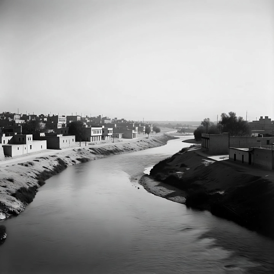 A serene black and white photograph captures a narrow river winding through a desert village. Traditional mud-brick buildings line both sandy banks, with sparse palm trees dotting the arid landscape. The image shows an empty scene with no visible people.