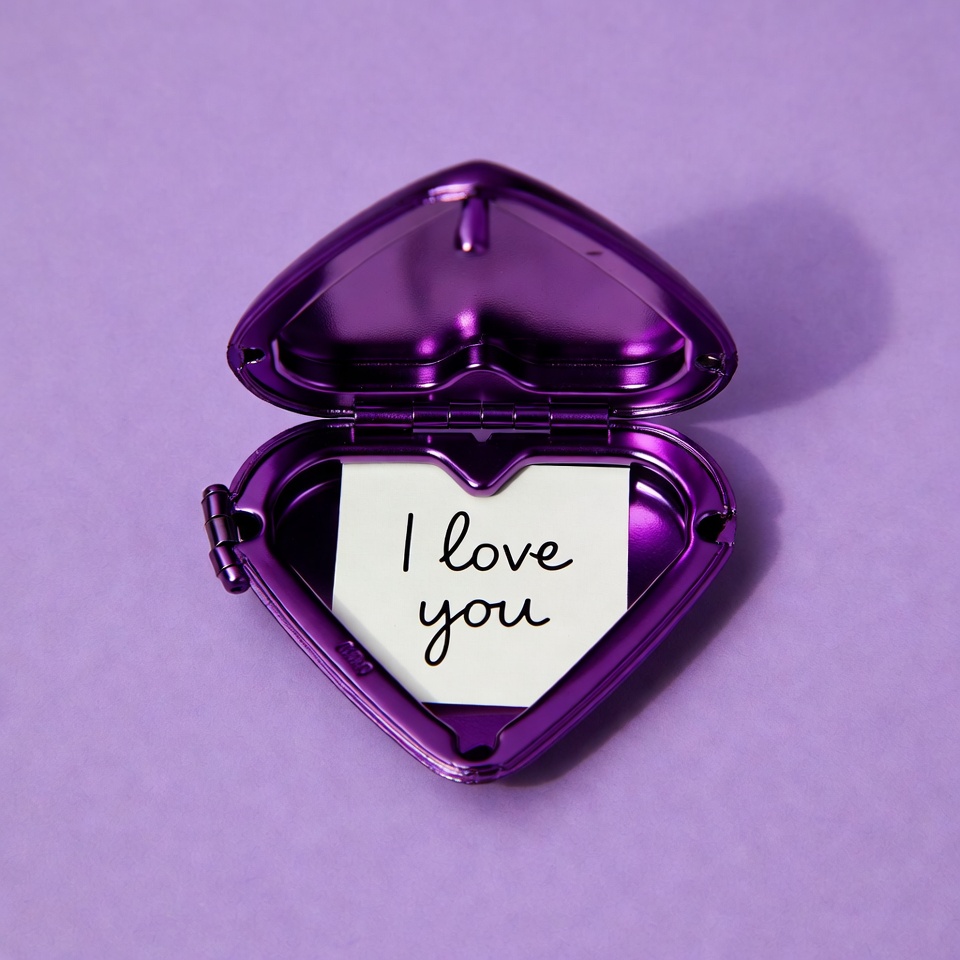 Open purple heart locket with I love you note