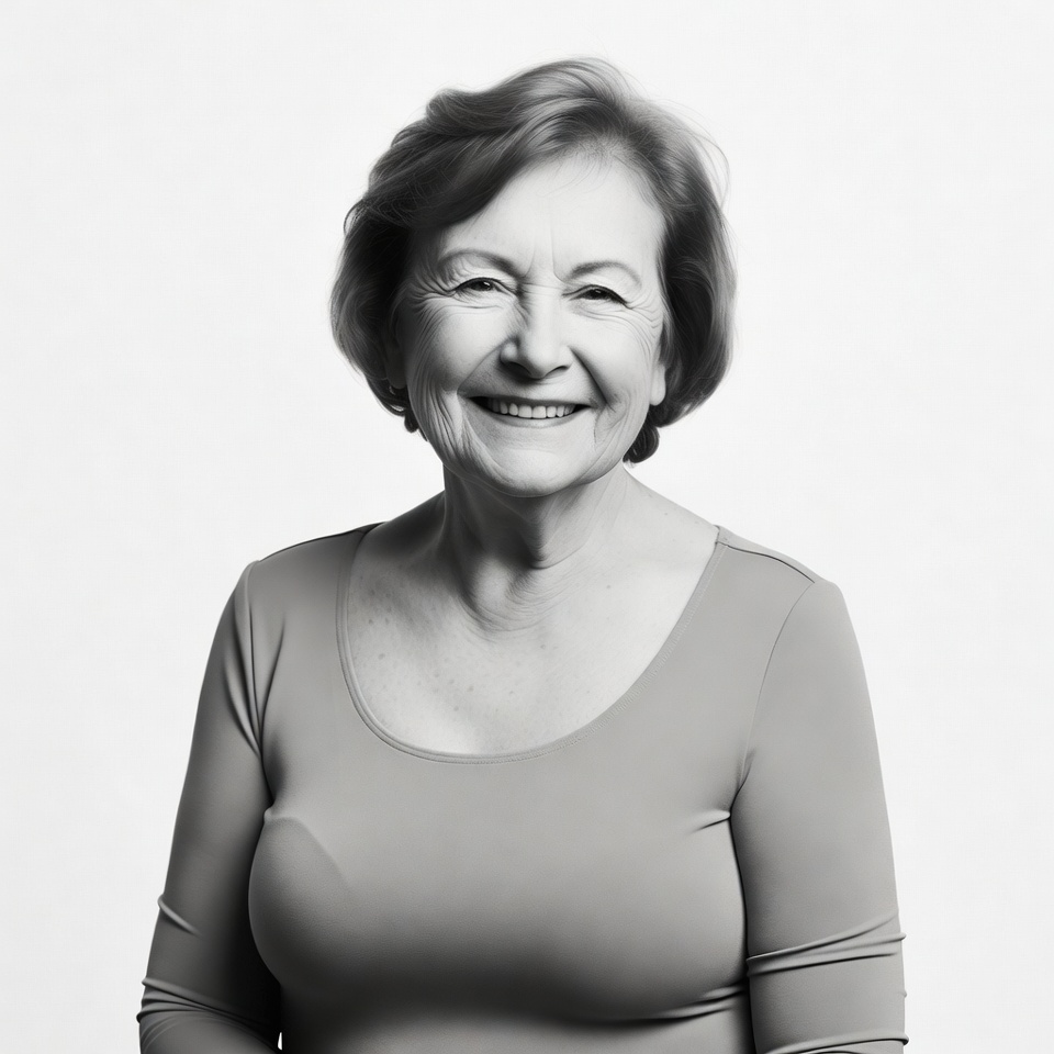 A grayscale portrait of an elderly White woman with short wavy hair smiles warmly at the camera. She wears a long-sleeved top with a scoop neckline and stands against a plain white background. Her expression is joyful with crinkled eyes and an open smile.