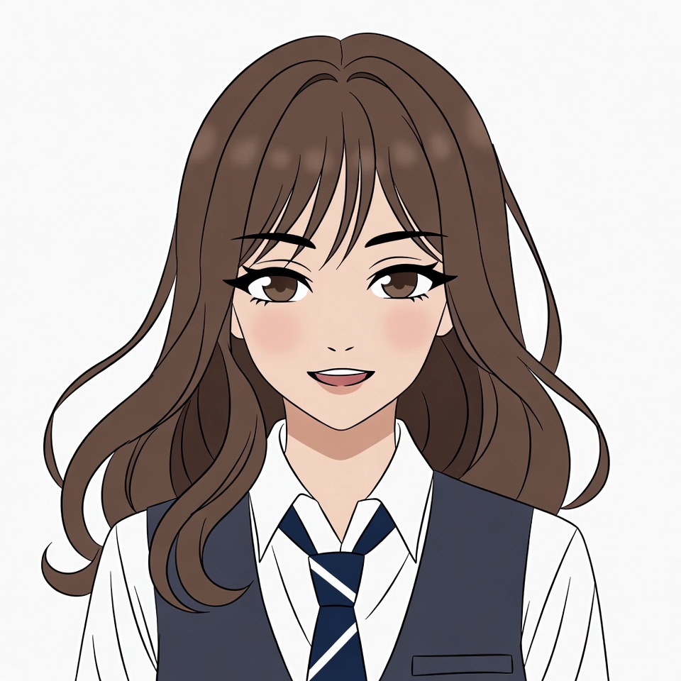 An anime-style illustration of a young Asian girl with long brown hair and blushing cheeks smiles happily. She wears a white collared shirt, navy vest, and blue tie. The portrait is set against a plain white background.