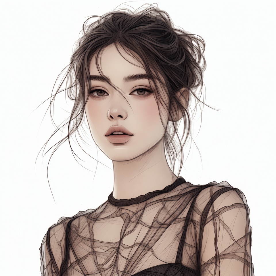 A young Asian woman with messy black hair in a loose bun gazes forward with subtle makeup and glossy lips. She wears a sheer black mesh top with a choker necklace. The digital illustration features her against a white background.