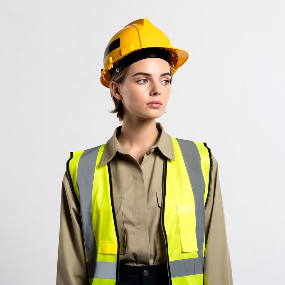 White, construction worker, female, hardhat, high visibility vest, isolated background, khaki shirt, portrait, professional attire, reflective vest, safety gear, safety helmet, safety vest, short hair, standing, worker, yellow hard hat, young woman, woman