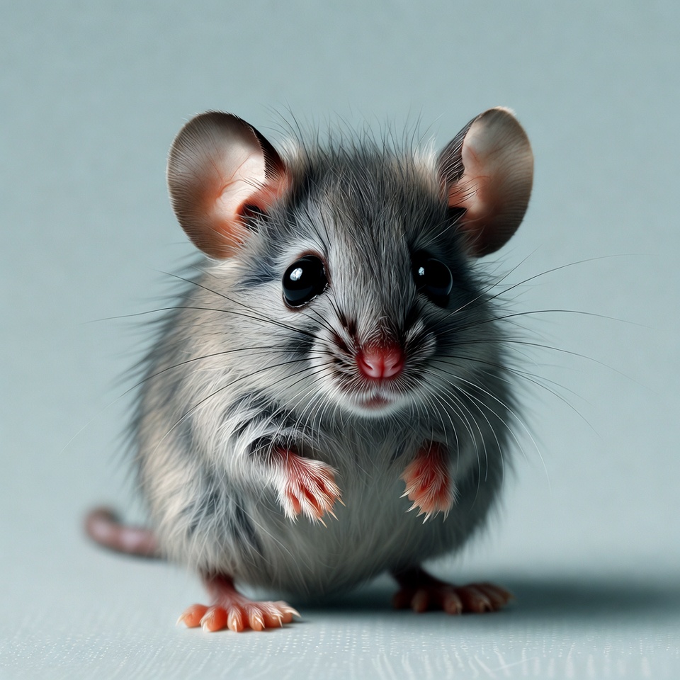 A small gray mouse with large round eyes and pink nose stands on a light blue background. Its soft fur is fluffy, and it has prominent ears and tiny paws with orange claws raised slightly forward. The mouse faces forward with a cute expression.
