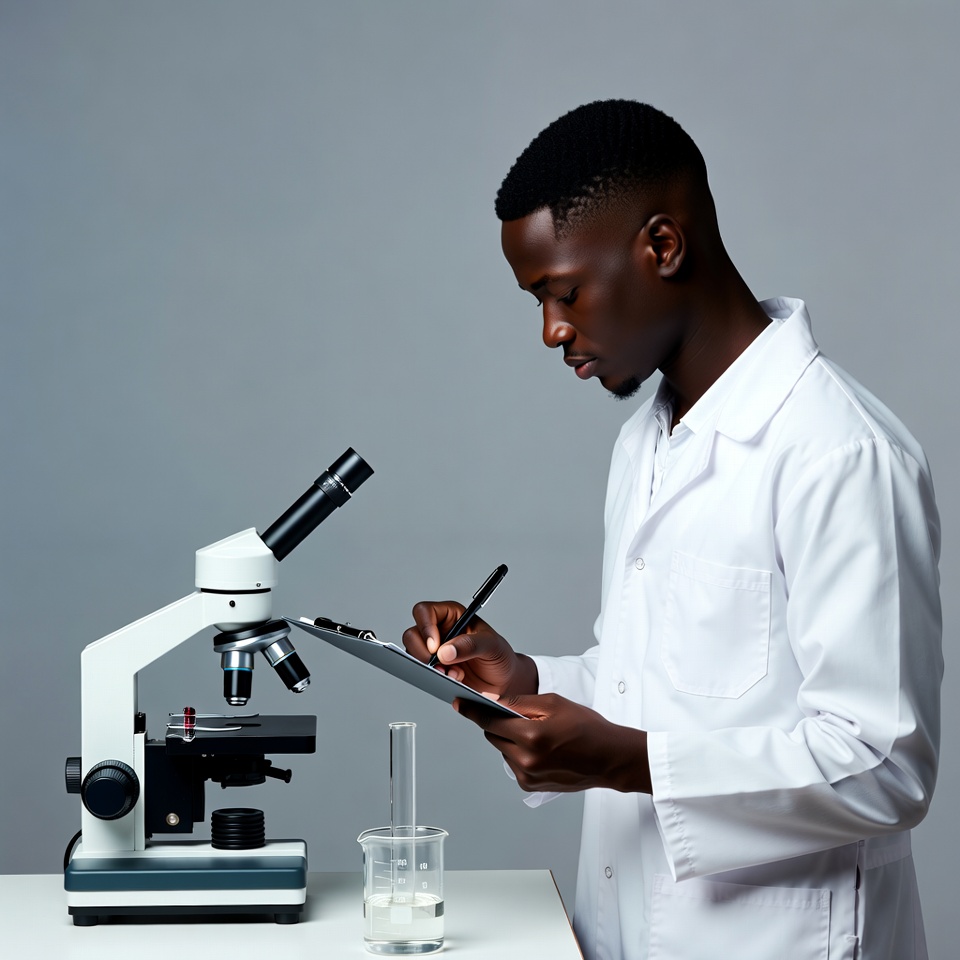 A young African-American man in a white lab coat stands at a lab table, examining a microscope. He holds a clipboard and pen, writing notes while a glass beaker with clear liquid sits nearby. The scene is set against a plain gray background.