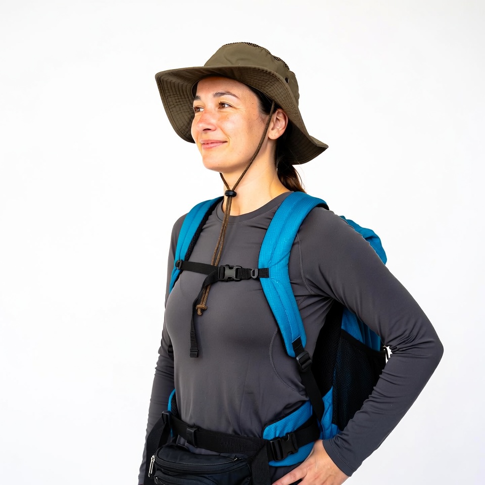 A woman with long brown hair wears a wide-brimmed khaki sun hat and smiles while looking upward. She is dressed in a gray long-sleeve shirt and carries a blue backpack with straps secured across her chest. She stands against a white background with a black fanny pack around her waist.