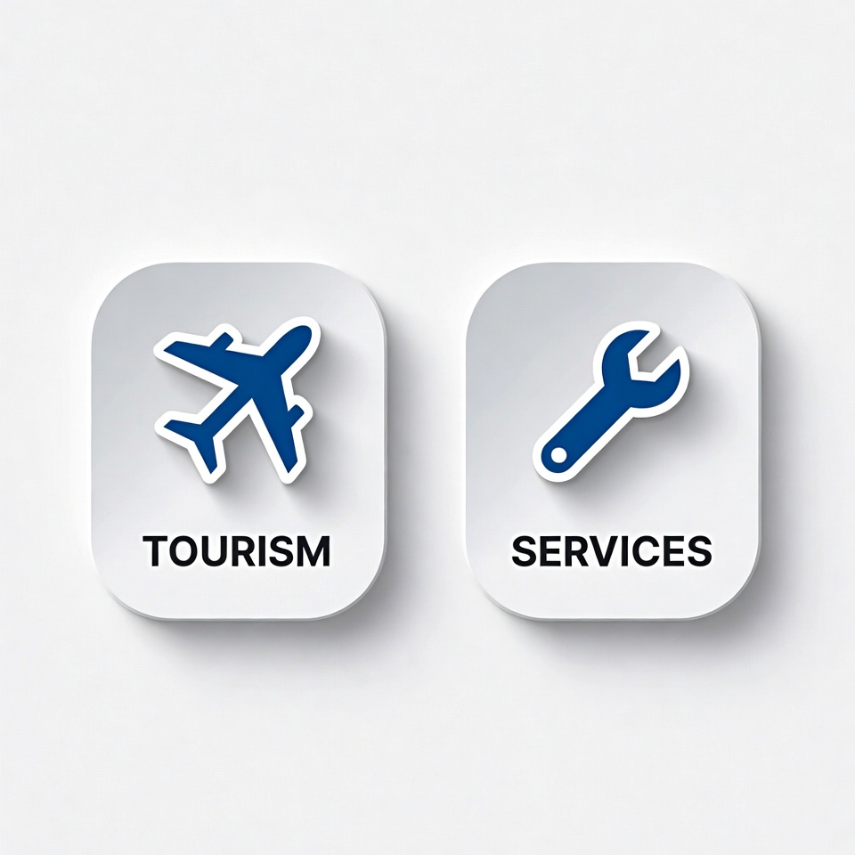 Two flat icons on a white background feature a blue airplane labeled 'Tourism' on the left and a blue wrench labeled 'Services' on the right. Both icons are set within rounded gray squares with bold text underneath. The design is simple and modern, suitable for UI or web graphics.