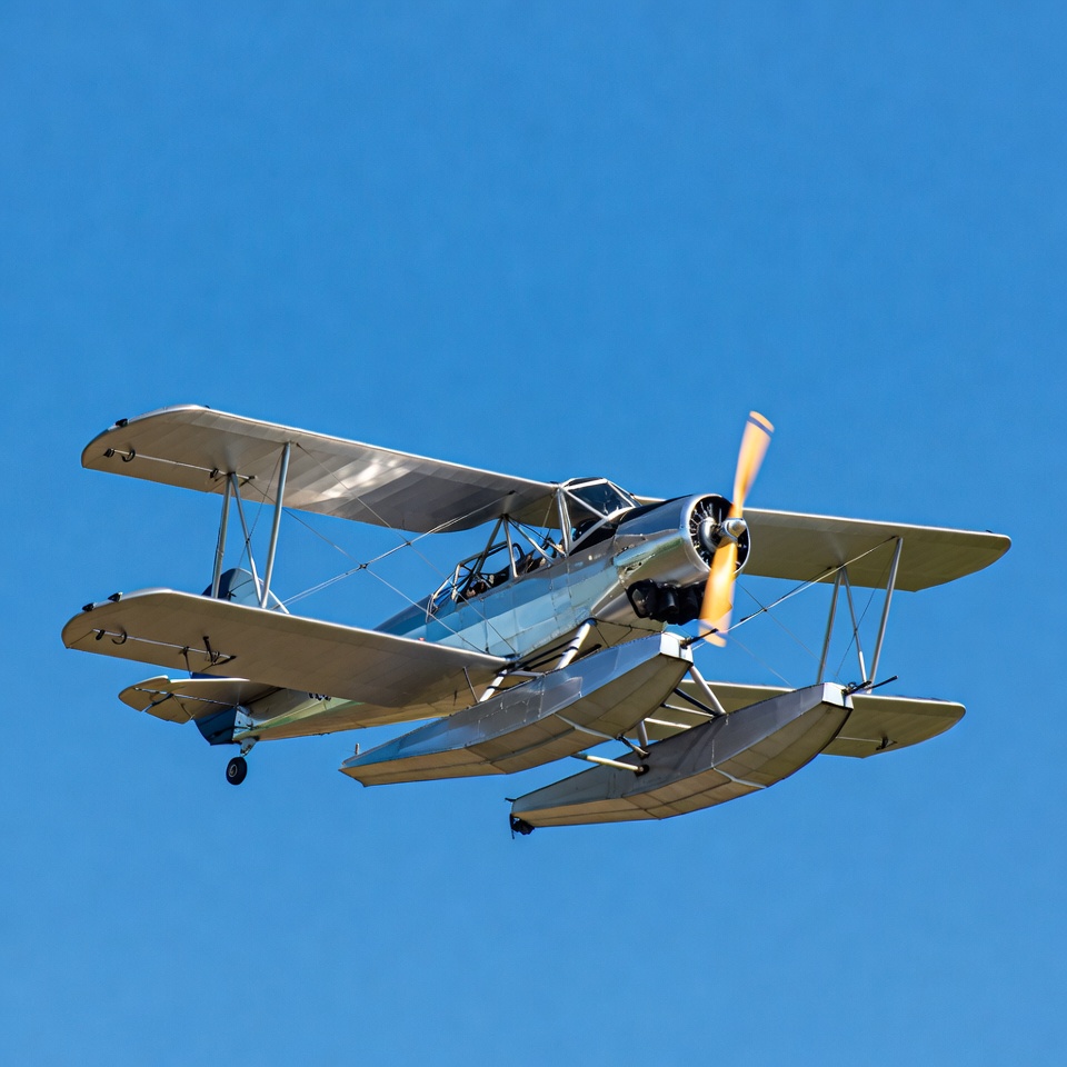 aerial, aircraft, airplane, aviation, bi-wing, biplane, biplane seaplane, blue sky, floatplane, flying, open cockpit, pontoons, propeller, silver aircraft, vintage plane, yellow propeller, seaplane