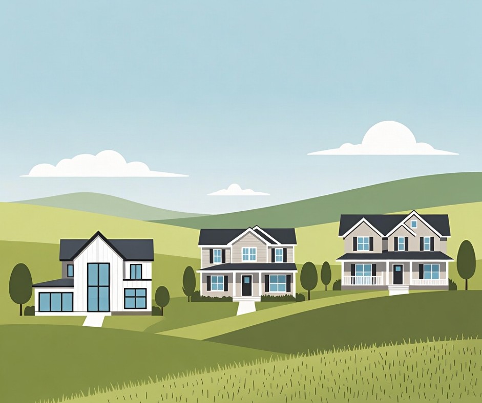 An illustration shows three modern houses with white and gray exteriors situated on rolling green hills. The houses feature large windows, porches, and trees nearby, set against a blue sky with white clouds. The scene depicts a peaceful suburban landscape with grassy fields and distant mountains.