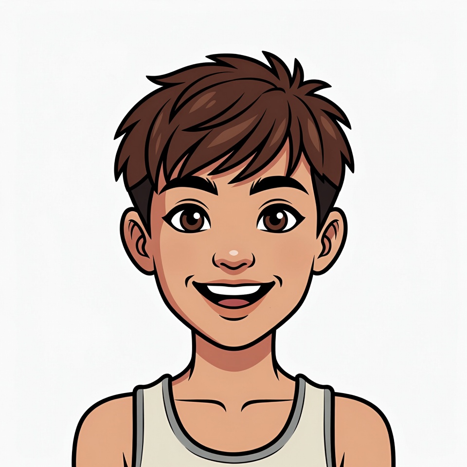 Asian, Asian boy, anime style, brown eyes, brown hair, clipart, happy face, illustration, isolated background, male, portrait, short hair, smiling boy, white tank top, young boy, cartoon boy