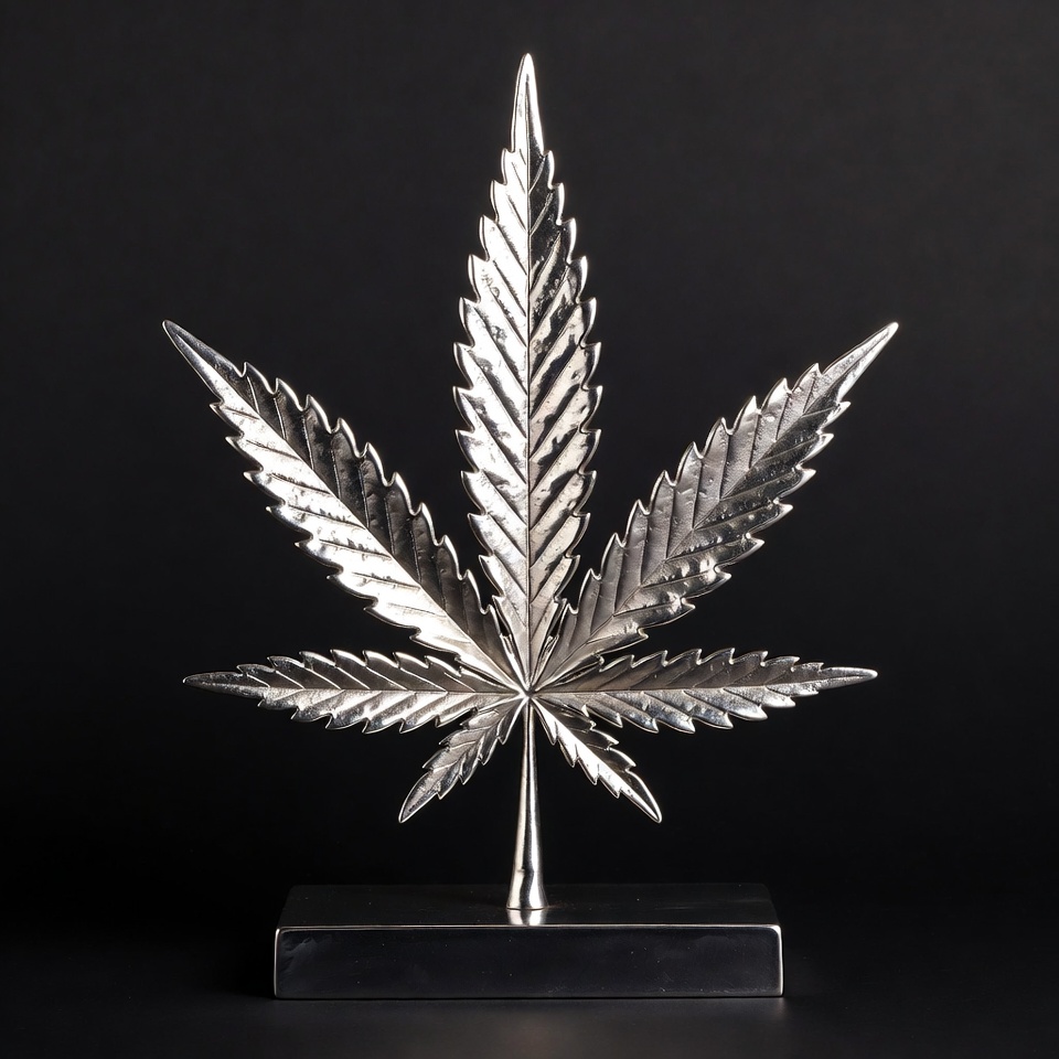 A shiny silver marijuana leaf sculpture stands on a black base against a solid black background. The leaf features detailed veins and pointed tips, mounted on a thin stem. It is isolated for a clean, metallic appearance.