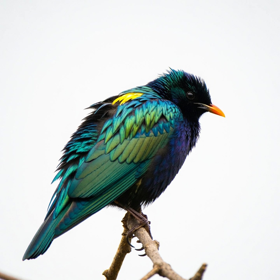 animal, avian, bird, black bird, blue feathers, branch, feathers, glossy, green feathers, iridescent feathers, isolated background, nature, orange beak, perched, starling, wildlife, yellow patch, grackle