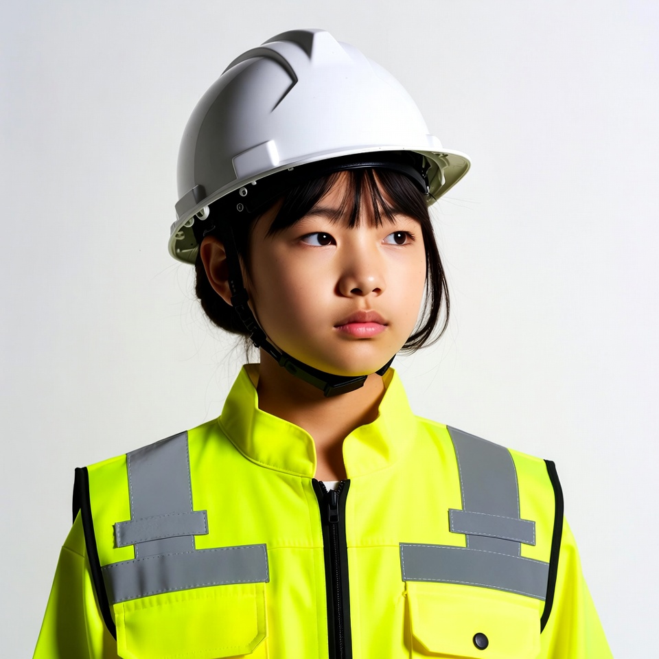 A young Asian girl with straight black hair wears a white hard hat and a bright yellow safety vest with reflective strips. She stands against a plain white background, looking directly at the camera with a neutral expression. Her hair is neatly tied back, and the vest features silver reflective bands on the shoulders and chest.