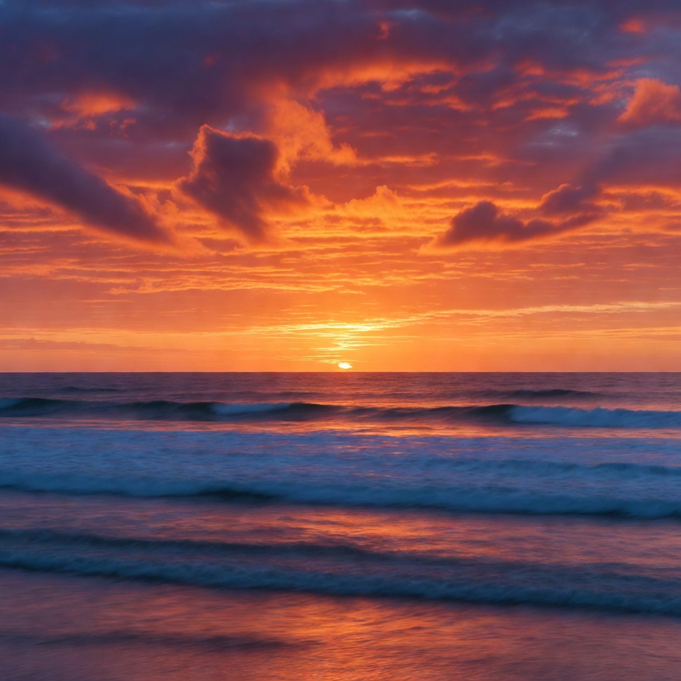 A vibrant sunset with orange and purple clouds reflects on the ocean. The sun sits low on the horizon above gentle waves rolling towards the shore. The sky transitions from deep blue to fiery reds.