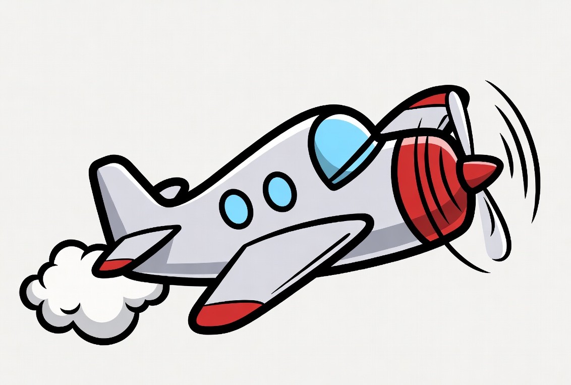 A colorful cartoon airplane flies with spinning propellers and white exhaust clouds trailing behind. It features a silver body, red propeller tips, blue windows, and red accents on the wings and tail. The illustration is on a white isolated background.