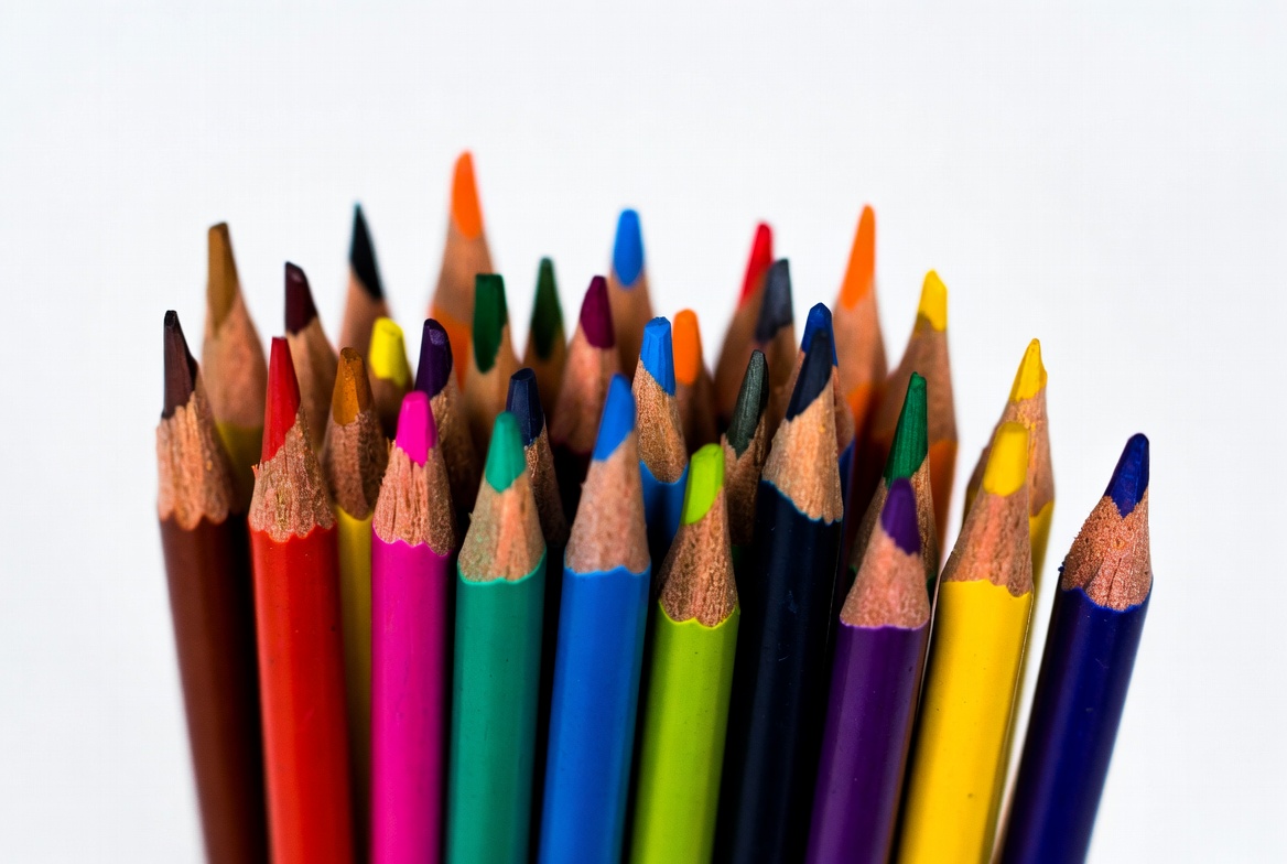 A bundle of colorful crayons stands upright on a plain white background. The crayons display a vibrant spectrum of colors including red, blue, green, yellow, and purple. Their tips and sides are sharply focused, creating a visually striking arrangement.
