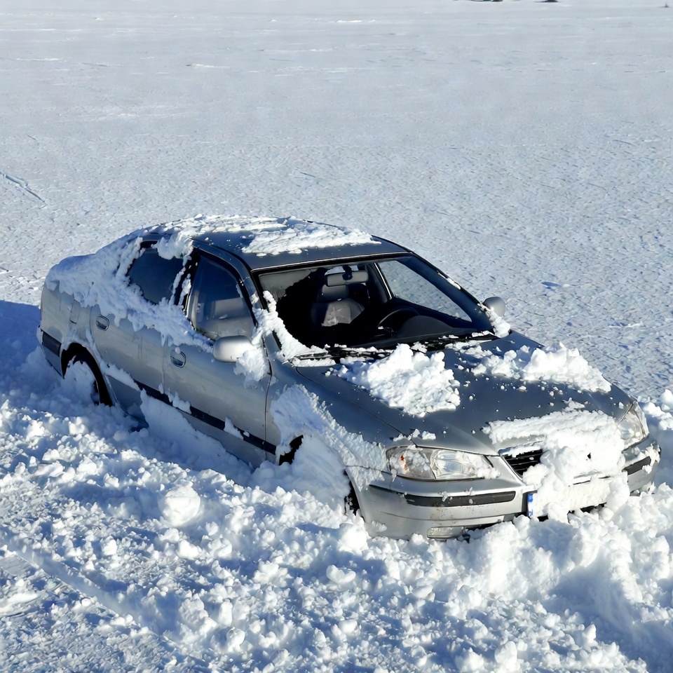 abandoned car, car in snow, deep snow, frozen field, icy road, sedan, silver car, snow, snow drift, snow-covered vehicle, snowy landscape, stuck, vehicle stuck, winter, car