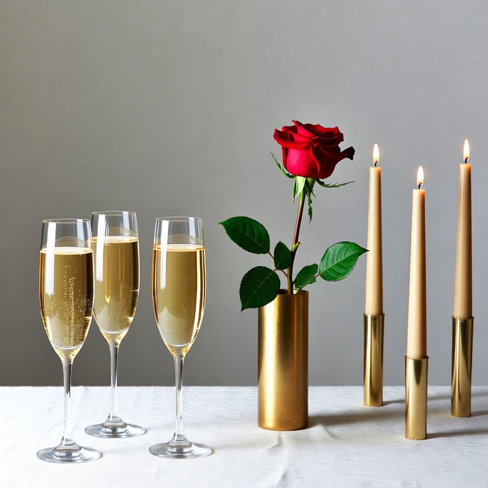 Two tall glasses of sparkling champagne stand on a white table. A single red rose in a gold vase is positioned between them, accompanied by several beige candles in gold holders. The setup is arranged against a plain gray background.
