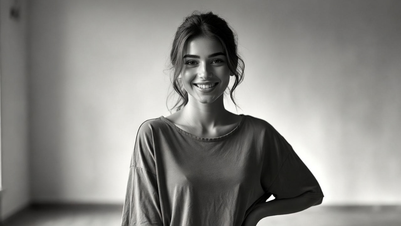 A young woman with loose wavy hair smiles warmly at the camera in a black and white portrait. She wears an oversized loose t-shirt with hands on hips, standing against a plain indoor background. Her expression is joyful and relaxed.