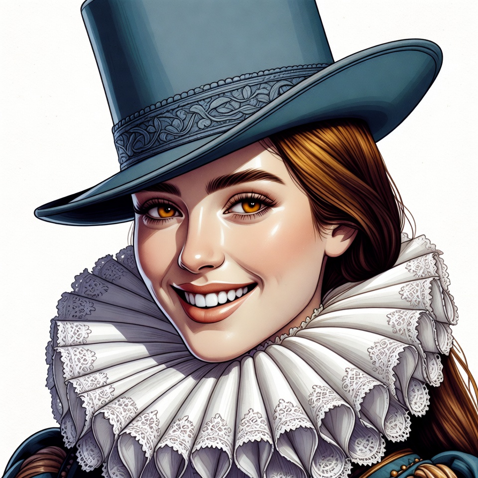 White, blue hat, brown hair, digital art, female, golden eyes, historical fashion, illustration, isolated background, ornate hat, portrait, ruff collar, ruffled collar, smiling woman, top hat, vintage attire, white ruff, young woman, woman