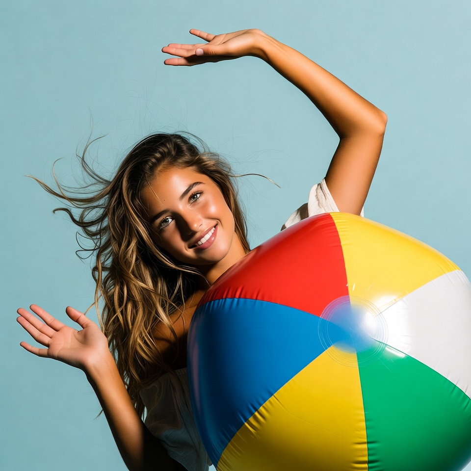 A young woman with long wavy brown hair smiles happily while holding a large inflatable beach ball with red, yellow, blue, and green sections. She wears a light off-shoulder top and raises both arms dynamically against a solid blue background. Her hair flows in the motion, emphasizing a playful beach vibe.