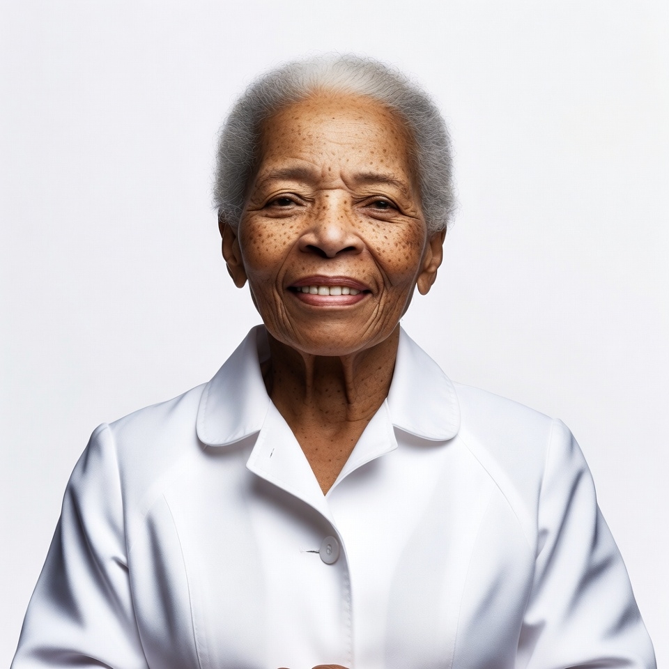 An elderly African-American woman with short gray hair smiles warmly at the camera. She has freckled skin and wears a white collared jacket with buttons. She stands against a plain white background.