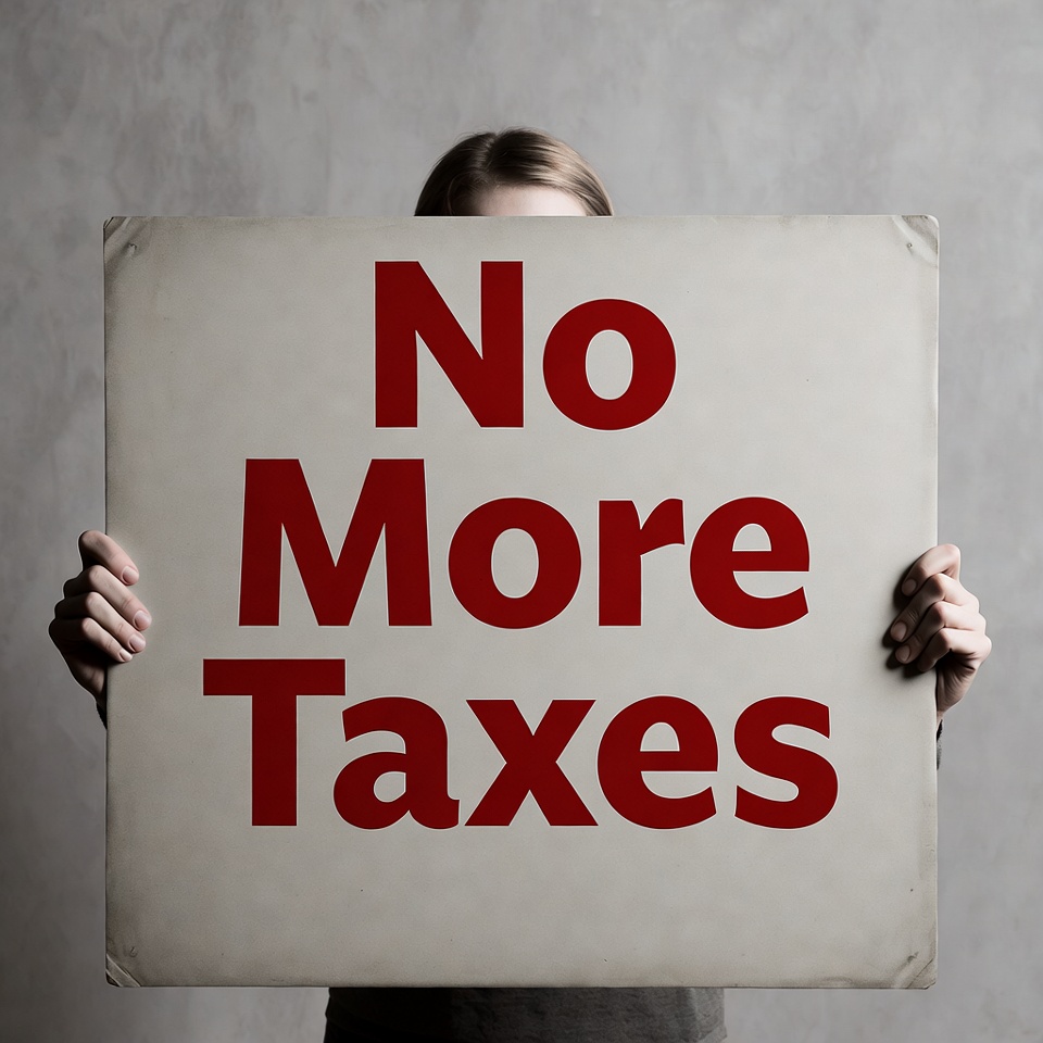 A woman with brown hair peeks over a large white sign reading 'No More Taxes' in bold red letters. She holds the sign with both hands against a gray background. Her face is partially visible above the top edge of the sign.