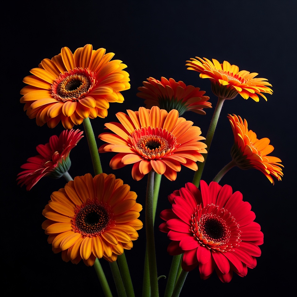 black background, bouquet, daisy flowers, floral cluster, flower arrangement, green stems, isolated background, orange flowers, red flowers, vibrant petals, gerbera daisies