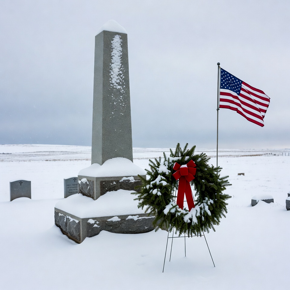 A tall gray obelisk monument covered in snow stands in a snowy cemetery. A large evergreen wreath with a red bow leans against its base on a metal stand. An American flag flies nearby amid scattered gravestones under a cloudy sky.