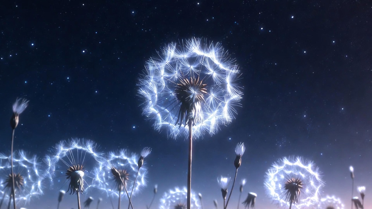 dandelion seeds, dark background, digital art, ethereal light, fantasy, floating dandelions, fluffy seeds, glowing dandelion, illustration, luminous flowers, magical plants, nature, night sky, starry night, stars, white glow, dandelion