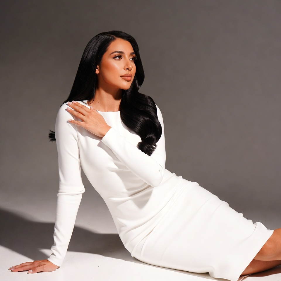 A beautiful woman with long dark wavy hair lounges on the floor wearing a form-fitting white long-sleeve dress. She poses with one hand on her chest and the other extended, gazing to the side against a plain gray background. Her makeup is glamorous with defined eyes and full lips.