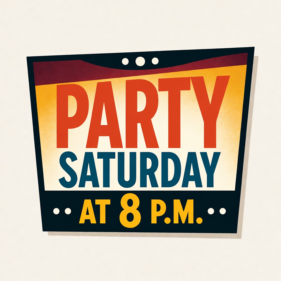 8pm, bold text, clipart, comic border, event invite, event poster, fun announcement, graphic design, illustration, invitation graphic, isolated background, marquee sign, red letters, retro style, saturday, typography, vector art, yellow text, party