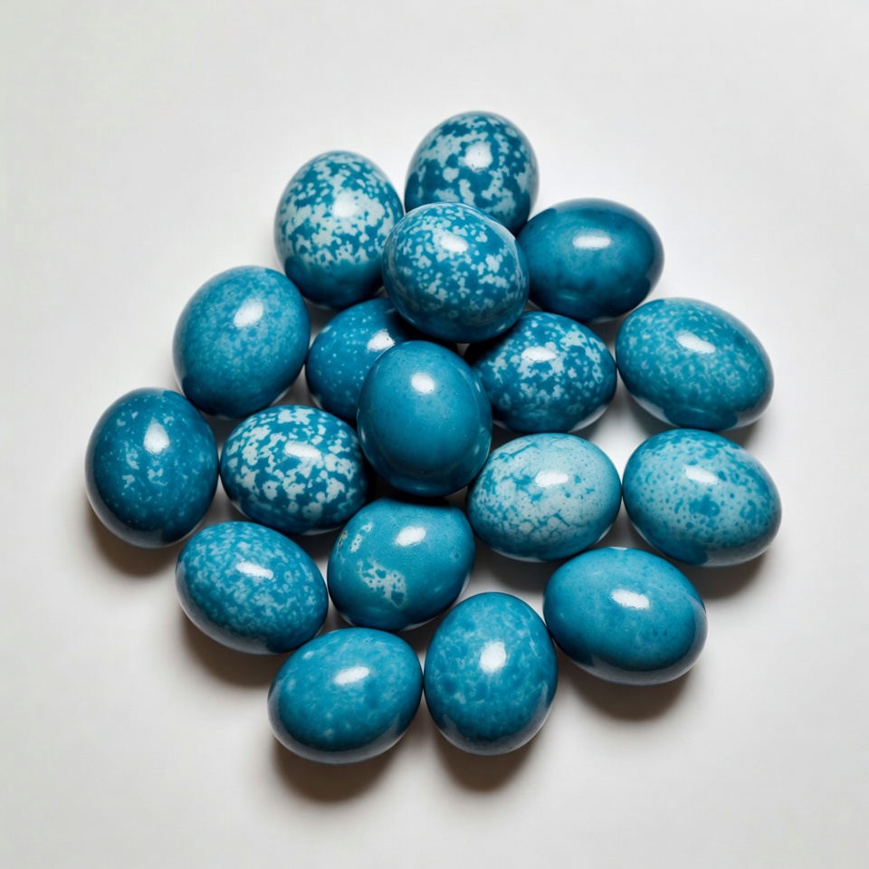 A cluster of blue Easter eggs with white speckled patterns is arranged in a circular pile on a white background. The eggs vary slightly in size and speckling density but maintain a uniform turquoise-blue color. They are photographed from above, isolated against the plain backdrop.