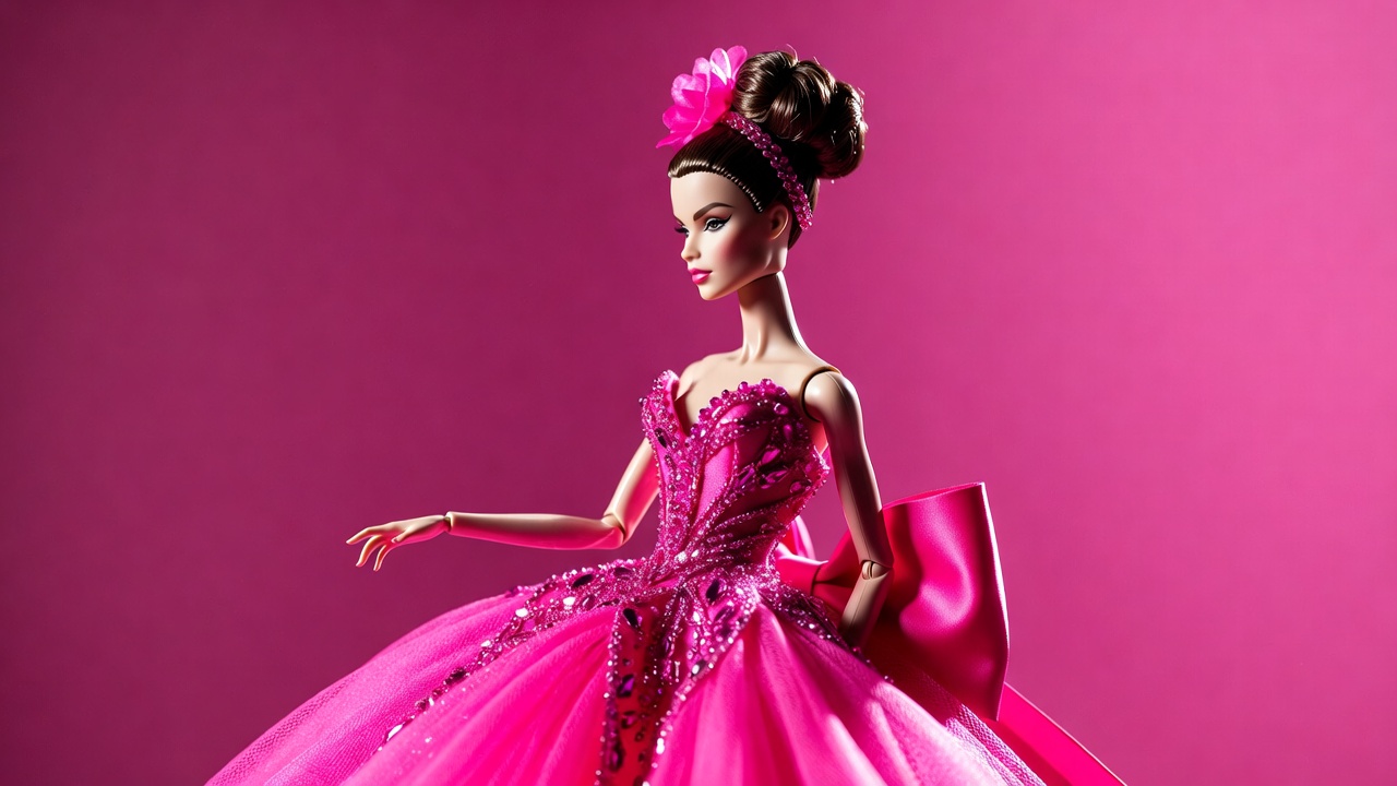 articulated doll, ball gown, beading, bow, collectible doll, doll fashion, doll hair, doll portrait, doll pose, elegant doll, evening gown, fashion doll, formal dress, glamorous gown, isolated background, pink background, pink dress, pink flower, pink gown, pink outfit, runway doll, sequins, toy doll, tulle skirt, updo hairstyle, Barbie doll
