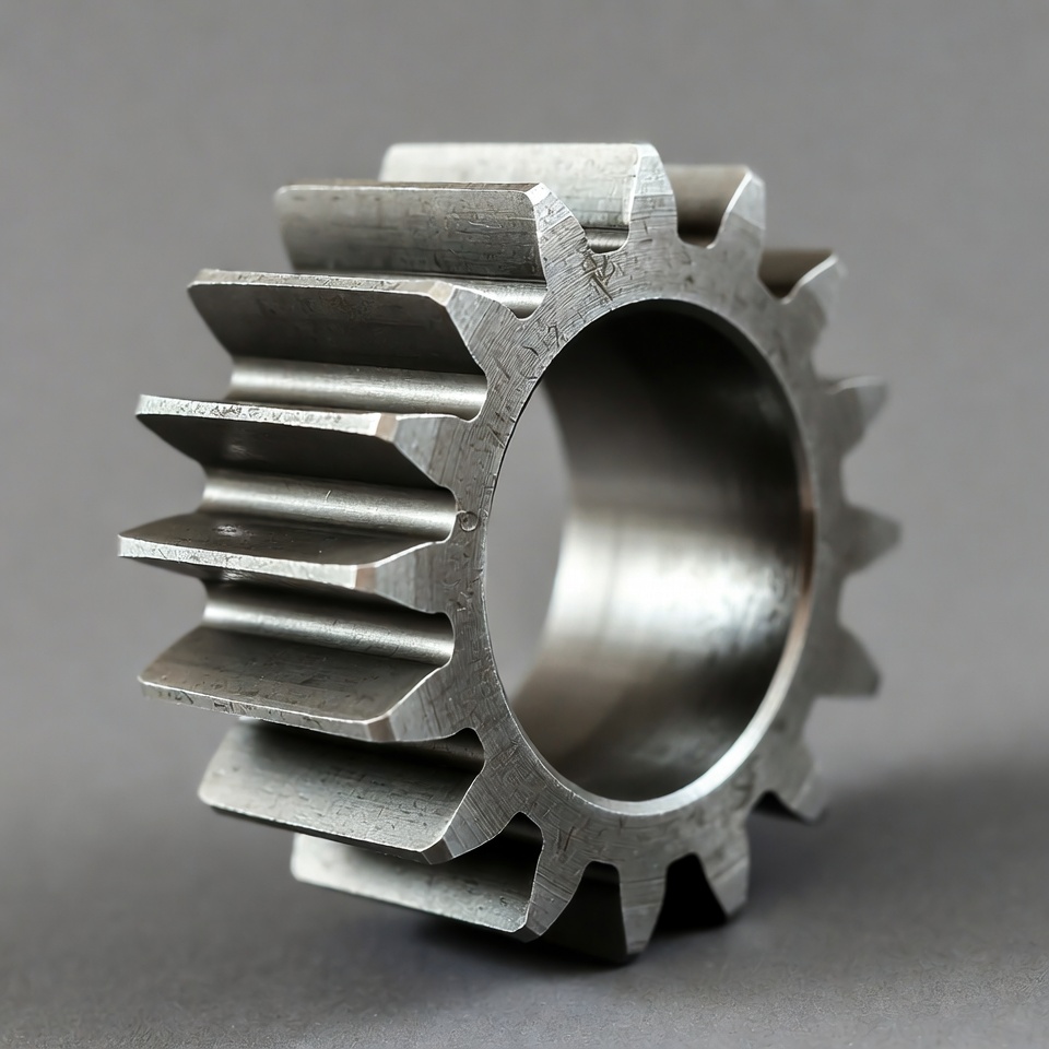 A close-up view of a large metallic spur gear with straight teeth and a central hole. The gear is made of shiny steel and positioned against a plain gray background. It appears industrial and precisely machined.