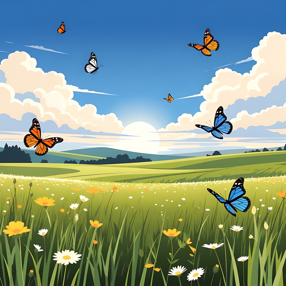 A vibrant illustration depicts a lush green field filled with yellow and white flowers under a bright blue sky with fluffy clouds. Numerous colorful butterflies in orange, blue, and white flutter above the meadow as the sun sets gently behind distant hills. The scene captures a serene natural landscape with vivid vector art style.